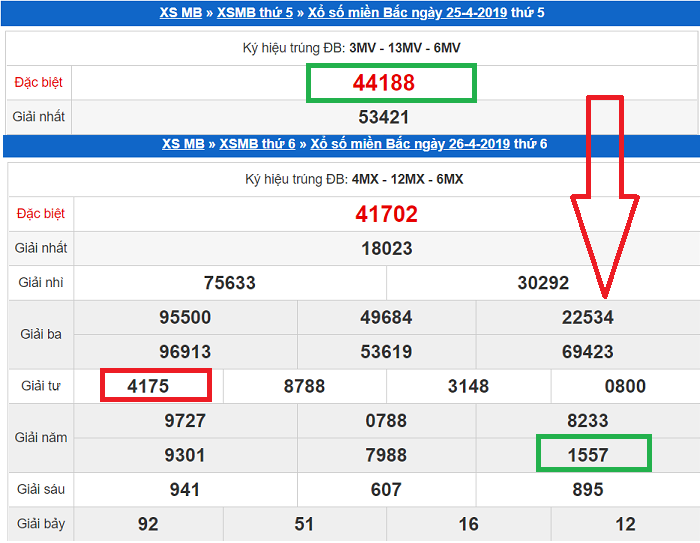 Ví dụ: KQMB ngày 25/4/2025 GĐB về 44188 – Ngày 26/4/2025 cặp 57 – 75 nổ
