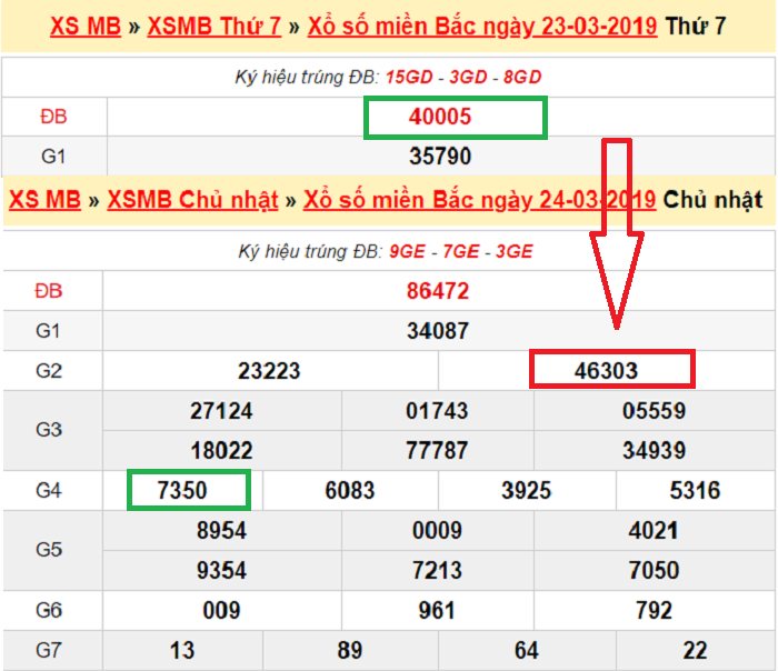 Ví dụ: KQMB thứ 7 ngày 23/3/2025 GĐB về 40005 – Ngày 24/3/2025 nổ lô 03 – 50